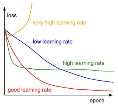 - 학습률은 가장 중요한 하이퍼파라미터 중 하나이다. 학습률이 너무 작으면 Loss가 거의 줄어들지 않을 수 있고 반대로 너무 크면 발산할 수도 있다. 일반적으로 1e-3 ~ 1e-5 값을 사용하는데 cross validation을 통해 최적의 값을 결정할 수도 있다
