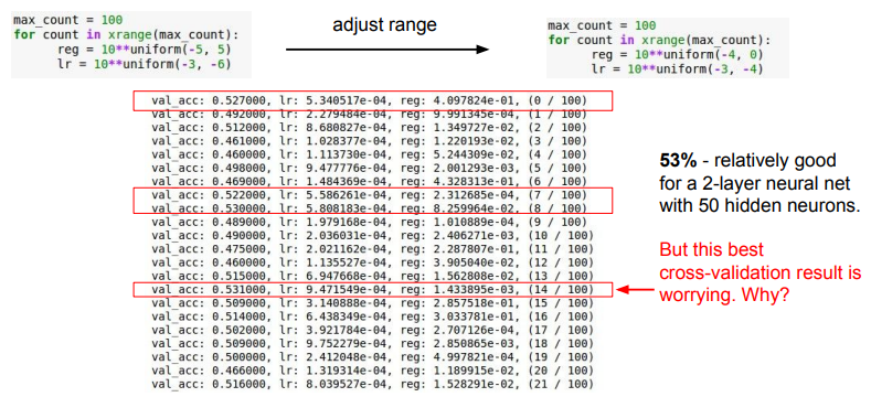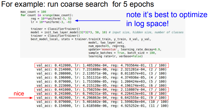 - 이때 학습률의 경우 lr = 10**uniform(-3, -6)과 같이 차수를 바탕으로 샘플링
