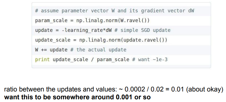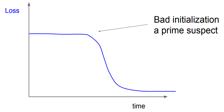 - 네트워크를 초기화한 후 초기 Loss가 그럴듯한지를 확인한다. 예를 들어 10개의 클래스가 있다면 softmax를 사용하는 경우 Loss는 대략 -log(1/10)로 약 2.3 정도가 된다. 이 값이 나오면 네트워크가 정상적으로 작동하고 있다는 것을 알 수 있다