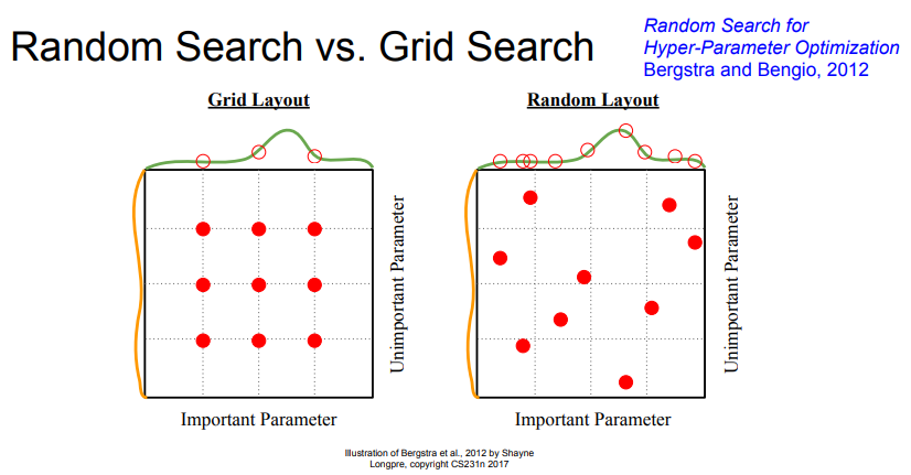 - 즉 초록색 파라미터 축 관점에서 임의 탐색은 9번의 샘플링이지만 격자 탐색은 3번의 샘플링에 불과함