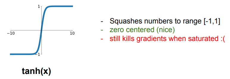 - sigmoid와 유사하지만 zero-centered (-1 ~ 1)