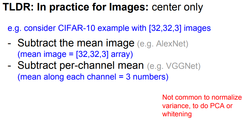 - 그러나 이미지 데이터의 경우, 주로 zero-centering만 하고 normalization은 잘 하지 않음 (원본 이미지의 공간 정보를 그대로 활용하기 위해)