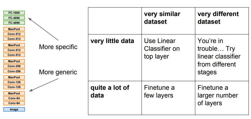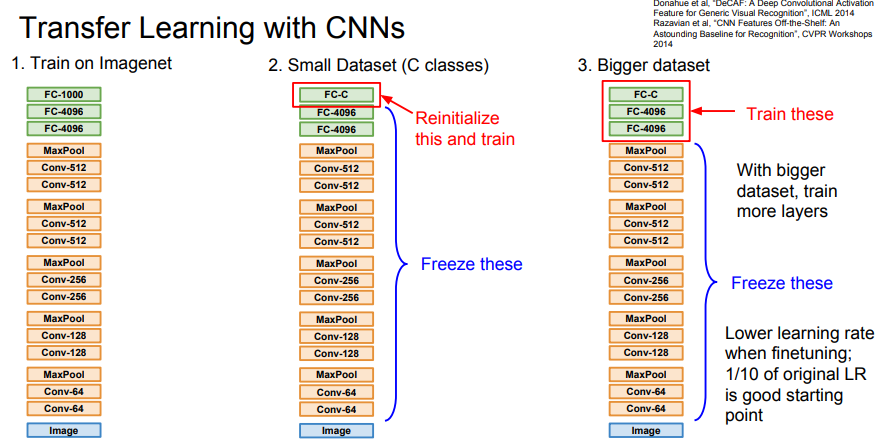 - 데이터셋이 작다면 사전 학습된 모델의 최종 FC Layer만 새로운 task에 맞게 재학습시키고, 나머지 네트워크는 동결(Freeze)