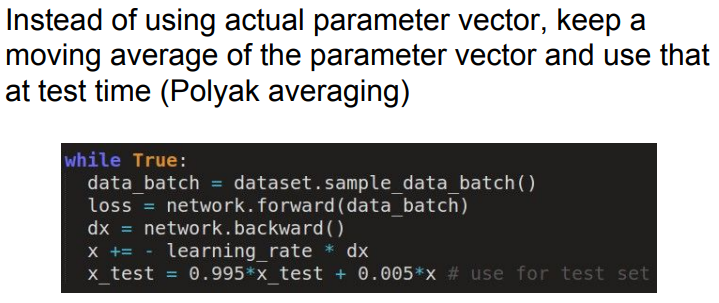 - 또한, 학습 중인 네트워크의 파라미터를 지속적으로 평균화하여 smooth ensemble 효과를 얻는 Polyak averaging 기법도 존재하나 실제로 자주 사용하지는 않음