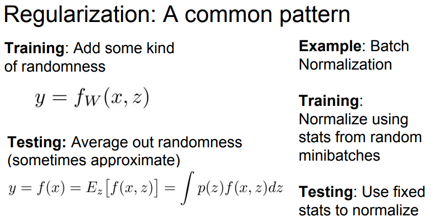 - 배치 정규화 또한 학습 시 미니배치 단위로 매번 서로 다른 데이터들이 만나 정규화가 이루어지면서 랜덤성을 얻고, 테스트 시에는 미치배치가 아닌 global 단위로 진행되면서 이러한 랜덤성을 평균화 함