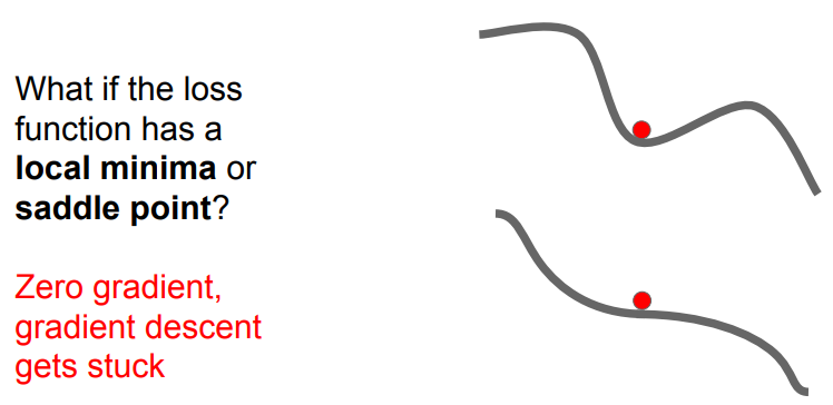 - SGD는 gradient가 0이 되는 지점에서 멈출 수 있는데, 이 경우 손실 함수의 optimal minima가 아니라 local minima일 수 있음