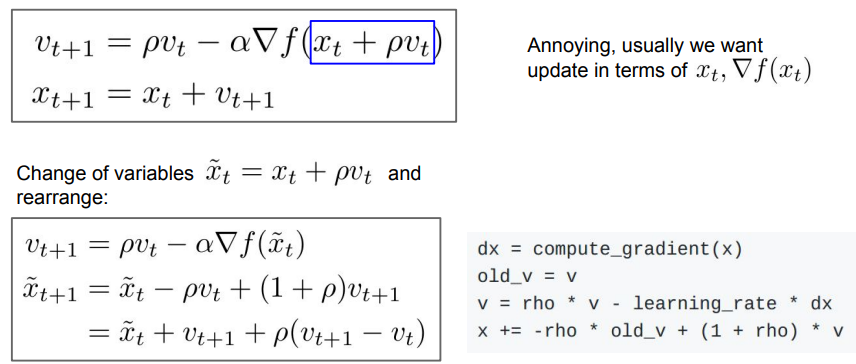 - velocity 방향으로 이동한 후 그 지점에서 gradient를 계산하고, 이를 다시 원래 위치에서의 velocity와 결합