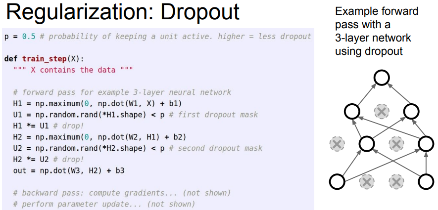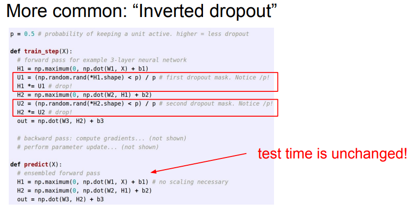- 그런데 test time에서 곱하기 연산이 추가되는 것도 거슬리니까 역으로 train time에서 p로 나눠주는 Inverted Dropout을 흔히 사용