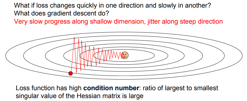 - 즉, loss에 영향을 거의 미치지 않는 수평 방향으로는 적게 업데이트 되고 loss에 큰 영향을 미치는 수직 방향으로는 많이 업데이트 되기 때문에 SGD가 잘 작동하지 않음