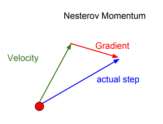 - 빨간 점이 현재 위치라고 가정했을 때 최종 업데이트는 gradient 벡터와 velocity 벡터의 가중평균으로 계산됨