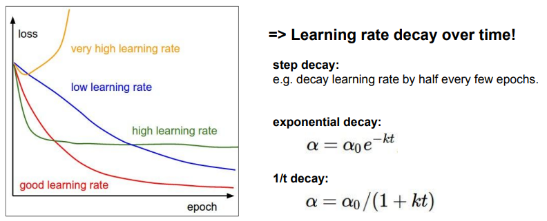 - 학습 과정에서 학습률을 점차 줄임으로써 처음에는 큰 step으로 빠르게 학습하고, 이후에는 작은 step으로 더 세밀하게 학습하는 전략을 사용할 수 있음