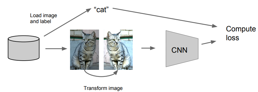 - horizontal flip, random crop, color jittering 등
