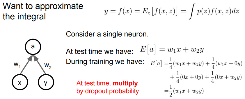 - 따라서 단순히 드롭아웃 확률 \( p \)를 곱해주어 모델 출력을 조정하는 식으로 이를 근사함