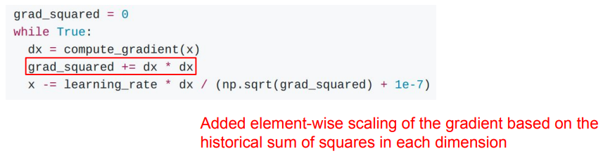 - 학습 과정에서 각 step마다 gradient의 제곱 값을 계산하고 이를 누적하여 업데이트 시에 그래디언트를 나눠줌 (각 차원 별로 element-wise 하게)