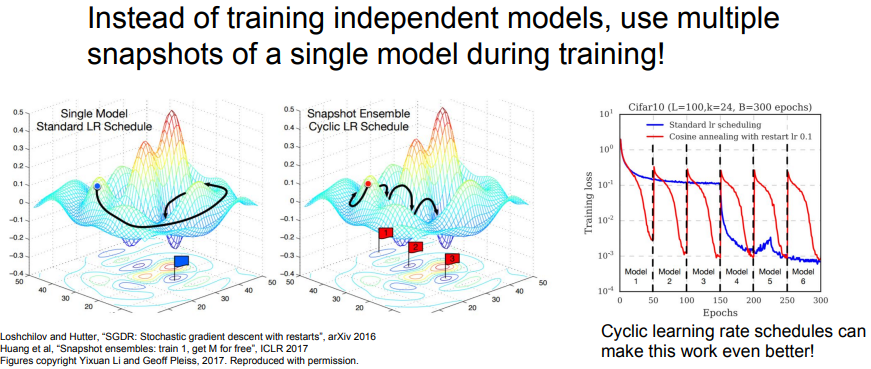 - 독립적인 여러 모델을 학습시키는 대신, 하나의 모델을 학습하는 과정에서 중간에 여러 번의 스냅샷을 저장하고 이들로부터 나온 예측값들의 평균을 사용하는 기법도 존재