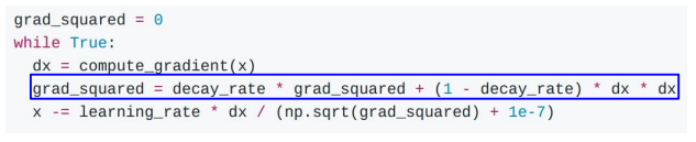 - AdaGrad의 개선된 버전으로, 학습 도중 계산된 gradient 제곱 값을 누적하는 대신 decay rate를 적용하여 가중치를 부여하고 최신 gradient에 더 높은 비중을 두는 방식