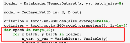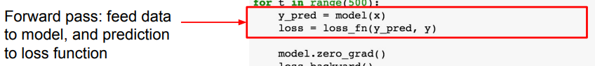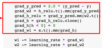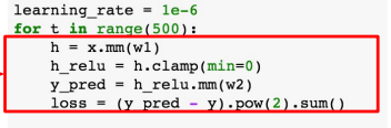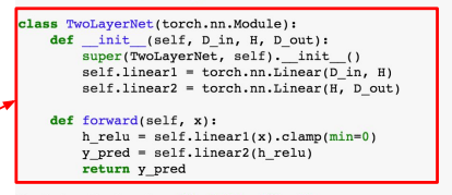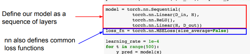 - nn 패키지에서 제공하는 Linear, ReLU, MSELoss를 이용하여 모델 및 손실함수 정의