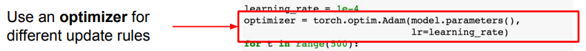 - 파이토치에서도 텐서플로우와 마찬가지로 가중치 업데이트 과정을 추상화하는 optimizer operations를 제공