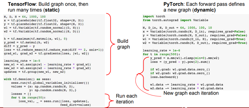 - 텐서플로우는 하나의 고정된 그래프(static graph)를 구성하여 이를 반복적으로 재사용 하는 반면, 파이토치는 매번 forward pass 마다 새로운 그래프를 구성하는 동적 그래프(dynamic graph) 방식