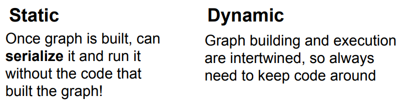 - 그래프 구성과 실행이 얽혀 있기 때문에, 모델을 재사용하려면 항상 원본 코드가 필요함. 이로 인해 그래프의 직렬화가 더 복잡