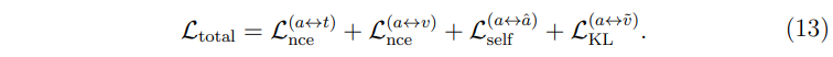 - KL Divergence를 활용하여 오디오-시각 유사도 점수가 시각-텍스트 유사도 점수를 모방하도록 함