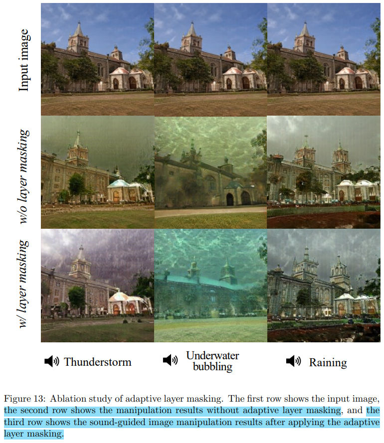KD loss와 비슷한 방식으로 Adaptive Layer Masking을 적용하지 않았을 때와 적용했을 때를 비교함으로써 그 효과에 대한 분석을 다룬 부분이다. Figure 13을 보면 'Thunderstorm'이라는 오디오 입력의 경우 번개 소리와 빗소리가 합쳐진 것이다. 적용하지 않았을 때는 번개가 잘 확인되지 않지만 적용했을 때는 잘 나타나는 것을 확인할 수 있다. Adaptive Layer Masking은 위와 같이 혼합된 오디오 입력에 대해 각 스타일의 특성을 모두 잘 살리는 데에 효과적인 것 같다는 생각이 든다.