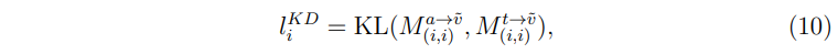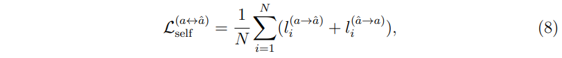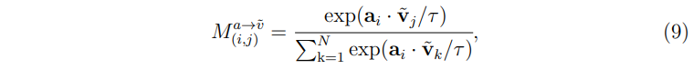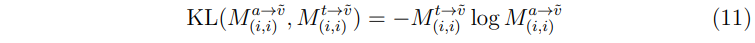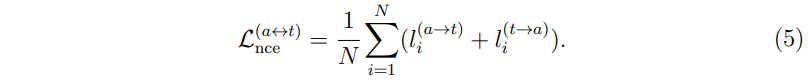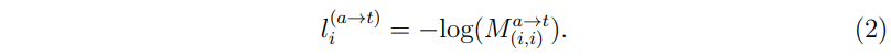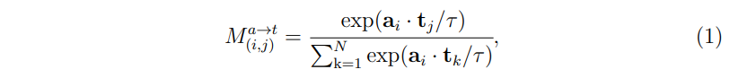 또한 이들을 대칭 행렬로 만들어주기 위해 \( M^{t\rightarrow a} \)의 전치 행렬인 \( M^{a\rightarrow t} \)을 동일하게 더해주어 최종적으로 (5)와 같은 loss를 구성한다.