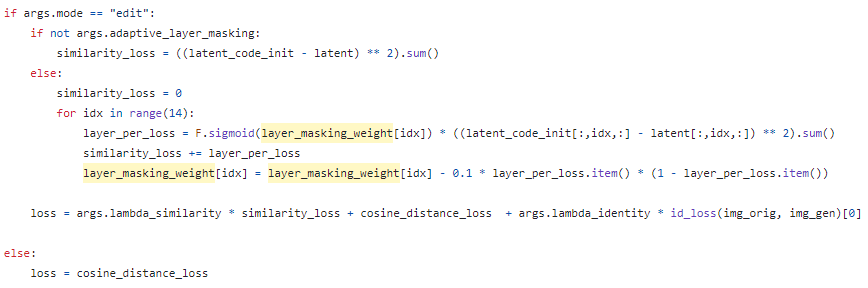 사전 학습된 g를 사용하는 것이 아니라 이미지 조작 과정에서 동시에 g가 업데이트된다는 것이 잘 와닿지가 않아서 마찬가지로 코드를 살펴봤다. layer_masking_weight가 g를 의미하는 것 같고 마지막 줄에 g(1 - g) 형태로 업데이트되는 것으로 보아 레이어 별 loss를 구하고 직접적으로 경사하강법을 통한 업데이트를 적용하는 것 같다. 다만 시그모이드를 왜 g에만 취했는지는 잘 이해가 되지 않는다. GitHub Link