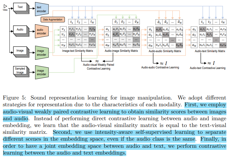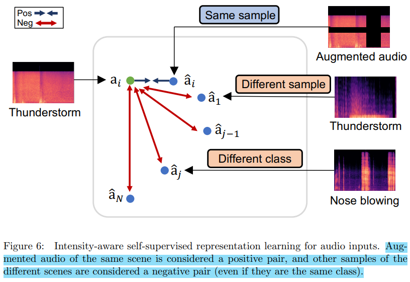 텍스트와 달리 오디오 데이터의 장점은 다양한 방식으로 표현될 수 있다는 것인데, 가령 'thunderstorm'의 경우 비가 거세게 올 수도 있고, 우박이 떨어질 수도 있고, 바람이 불 수도 있다. 이러한 오디오 데이터의 미묘한 차이를 반영하여 강도를 인식한(intensity-aware) 사운드 표현을 얻고자하는 자가지도 학습 방법을 적용하였다. 중요한 점은 Figure 6에서 볼 수 있듯이 와 같이 동일한 클래스이더라도 표현 방식이 다르면(논문에서는 이를 view, scene이라 표현) 부정 쌍으로서 더 멀게 배치된다는 점이다.