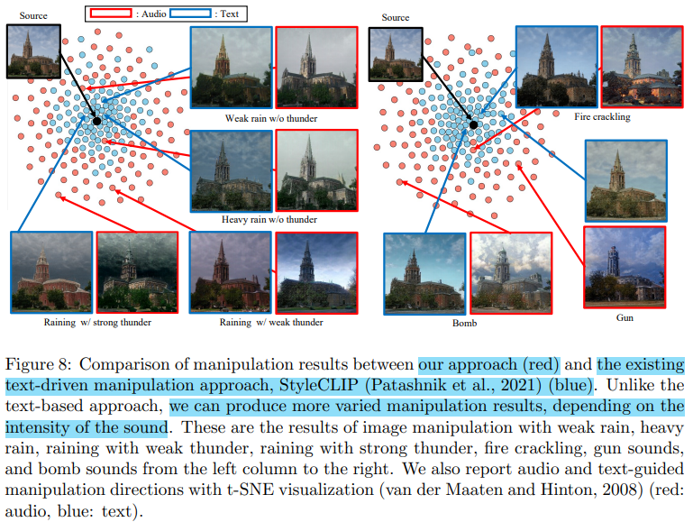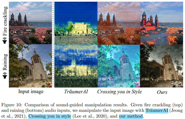 기존의 오디오 기반 스타일 트랜스퍼 모델들과의 비교를 다룬 부분이다. Figure 10을 보면 불이 타닥거리는 소리와 비가 오는 소리를 입력했을 때 기존의 모델인 TraumerAI와 Crossing you in Style은 아예 의미론적 단서를 찾지 못한 반면 제안된 방식은 성공적인 조작 결과를 얻은 것을 확인할 수 있다.