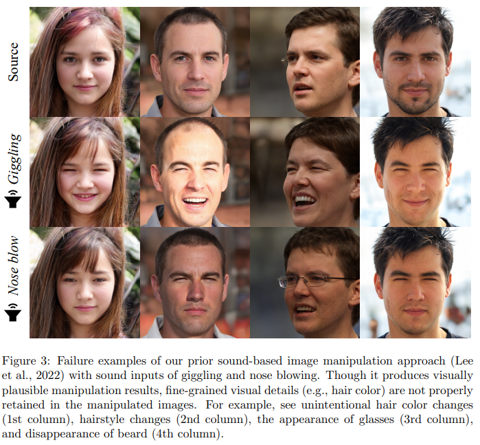 최근 연구들은 스케치, 텍스트, 사운드와 같은 멀티모달 정보를 활용해 이미지를 조작하는 방법들을 제시해 왔다. 그러나 텍스트와 같은 이산적(discrete) 입력은 사용자 의도를 충분히 표현하지 못하는 경우가 많다. 이에 반해 사운드는 시간에 따라 연속적(continuity)이고 역동적(dynamic)인 특성을 가지며, 이미지 조작을 더욱 다양하고 생동감 있게 만들어 줄 수 있다.