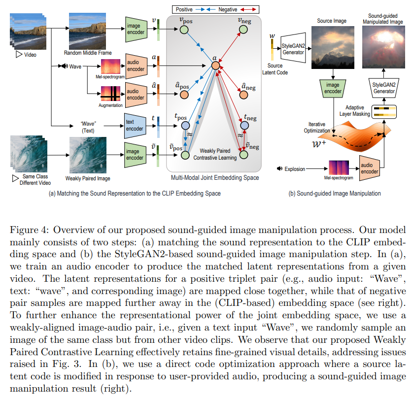 그러나 이미지 조작에 있어서 오디오-비주얼 표현 학습은 4억 개의 이미지-텍스트 쌍을 사용하여 자가 지도 학습된 CLIP의 긍정 쌍만큼 충분히 학습되지 못했다는 점에서 아직 발전의 여지가 있다. 이를 위해 최근 연구들은 사운드 임베딩 공간을 CLIP 임베딩 공간과 맞추는 방법을 제안했다(Wav2CLIP, AudioCLIP). 특히 직전 연구(Lee et al., 2022)에서는 오디오-텍스트 데이터셋과 비디오에서 추출한 오디오-비주얼 스트림을 이용해 CLIP 기반 사운드 잠재 표현을 얻기 위해 오디오 인코더를 처음부터 훈련시켰다.
