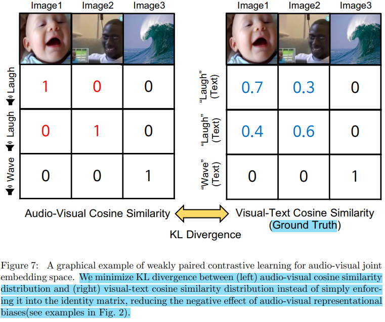 기존의 대조 학습은 오직 동일한 비디오로부터 추출된 오디오와 이미지를 긍정 쌍으로 간주하여, 혹여나 다른 비디오로부터 추출된 이미지들이 비슷한 시각적 특징을 가지고 있더라도 이는 부정 쌍으로 간주되어 멀리 배치되었다. 이를 해결하고자 동일한 텍스트 레이블을 가진 다른 이미지와도 약하게 페어링될 수 있는 대조 학습 기법을 제안하였다.