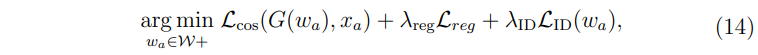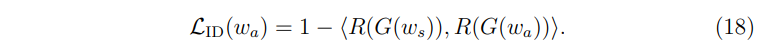 식 (14)의 최적과 과정에서 마지막에 해당하는 \( L_{ID}(w_a) \) 부분이다. 여기서 R은 ArcFace(Deng et al., 2019)라고 하는 사전 학습된 얼굴 인식 모델이라고 한다. < , >로 표현된 부분은 두 벡터 간의 코사인 유사도를 의미한다. 종합적으로, identity loss는 ArcFace 모델의 잠재 공간에서 원본 이미지와 조작된 이미지와의 유사도가 최대가 되게 한다. 이는 조작된 이미지가 원본 이미지의 아이덴티티(얼굴 특징)를 최대한 잘 유지하도록 하기 위함인 것을 알 수 있다. 추가적으로 \( \lambda_{ID} \)의 값은 사람이 아닌 이미지에 대해서는 0의 값으로 설정한다.