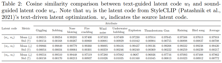 잠재 코드 \( w_s, w_a, w_t \) 간의 코사인 유사도에 대한 평균과 분산 값을 계산함으로써 조작된 잠재 코드에 대한 분포 정도를 분석하였다. Table 2의 첫 행과 두 번째 행을 비교해보면 첫 번째 행에서 모든 속성에 대해 코사인 유사도에 대한 분산이 큰 것을 확인할 수 있다. 이는 오디오에 의한 잠재 코드 \( w_a \)가 텍스트에 의한 잠재 코드 \( w_t \)보다 더 멀리 움직이는 것을 의미하며 이를 통해 더 풍부하고 극적인 이미지를 생성해낼 수 있는 것으로 해석할 수 있다.