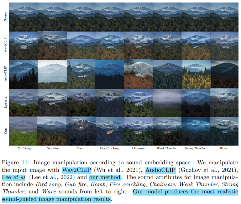 제안된 방식과 유사하게, CLIP 기반의 임베딩 공간을 사운드로까지 확장한 기존의 다른 모델들과의 비교를 다룬 부분이다. Figure 11에서와 같이 다양한 사운드 입력에 대해 제안된 방식의 멀티모달 임베딩 공간이 기존 모델들보다 시각적으로 더 좋은 결과를 생성한 것을 확인할 수 있다.