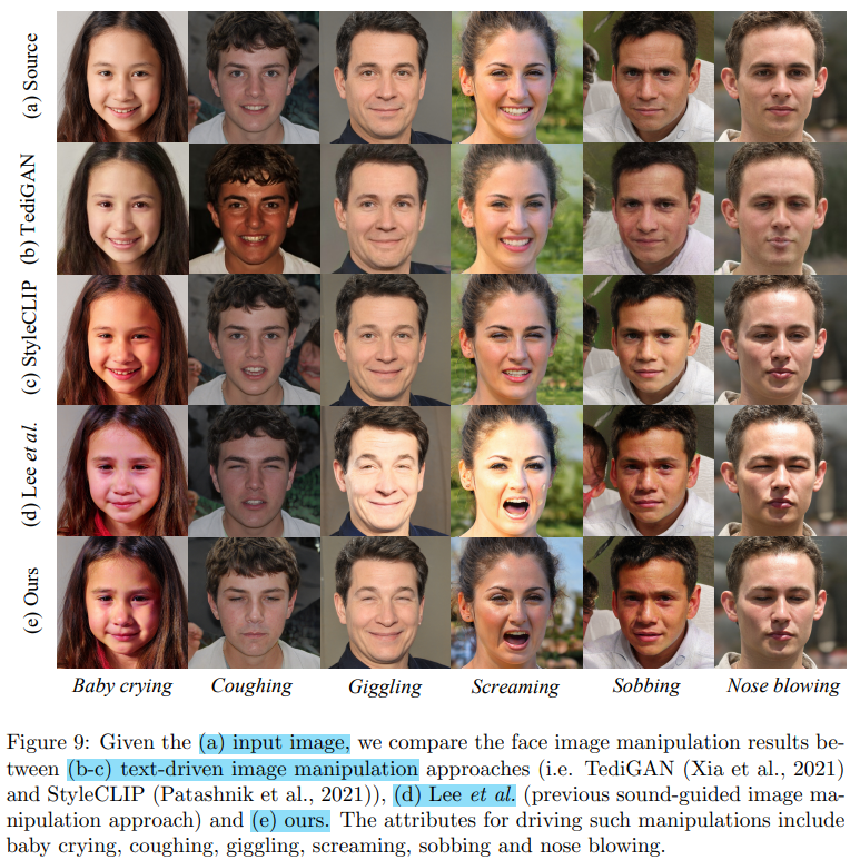 논문에서 제시한 오디오 기반의 이미지 조작 결과를 기존의 텍스트 기반의 이미지 조작 방식과 비교하는 내용을 담고 있다. Figure 9에서 볼 수 있듯이 오디오 기반의 방식((c)와 (d))이 텍스트 기반의 방식((b), (c))보다 더 나은 품질을 생성한다. 또한 'Baby crying'이라는 속성에 대해 (b) TediGAN은 'crying'을 강조하고 (c) StyleCLIP은 'baby'를 강조하는 반면 제안한 방식은 두 특징을 동시에 표현하는 것을 확인할 수 있다.