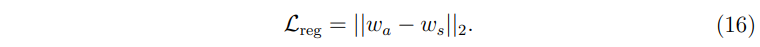 앞서 식 (14)에서 \( L_{reg} \)에 해당하는 부분이다. 일반적으로 L2 정규화는 이동된 잠재 코드로부터 생성된 이미지가 원본과 상이한 것을 효과적으로 조절해준다(이미지 조작에서 있어서의 L2 정규화 효과를 얘기하는 것 같음). 이는 식 (16)으로 표현되지만, StyleGAN2의 잠재 코드가 각 레이어마다 서로 다른 속성을 가진다는 특성을 반영하여 이를 식 (17)과 같이 변형해서 사용하였다.
