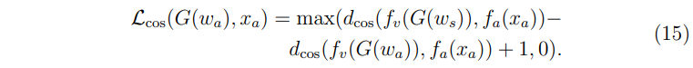 잠재 코드를 직접적으로 최적화하는 방법은 식 (14)의 첫 번째 항인 식 (15)로 표현되는 loss를 최소화함으로써 이루어진다. 먼저 hinge loss의 형태이고 코사인 거리가 2개 있는 것을 확인할 수 있다. 편한 설명을 위해 이를 max(A - B + 1, 0)과 같이 첫 번째 코사인 거리를 A, 두 번째 코사인 거리를 B라고 하면 다음과 같이 해석할 수 있을 것 같다. (\( f_a\), \( f_v \)는 각각 오디오, 이미지 인코더를 의미)