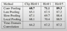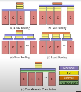 - Conv pooling: 가장 간단한 max pooling. averaging이 아닌 max를 사용한 이유는 비디오 길이가 긴 만큼 핵심 정보를 max로서 살리기 위함