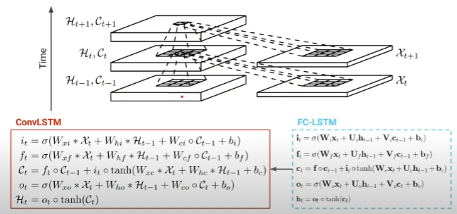 - LSTM 셀 안에 있는 i, f, o, c, h가 2D로 변환되며 공간적 정보를 유지하기 위해 모든 연산이 컨볼루션으로 바뀜