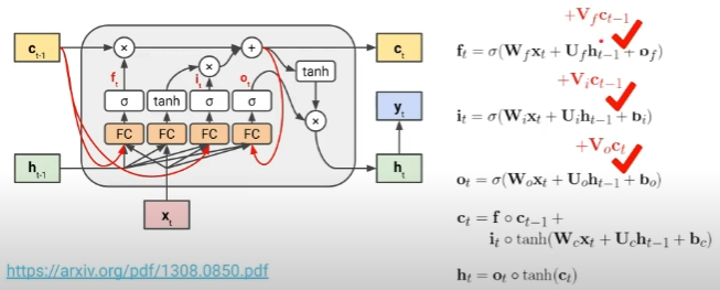 - 그림과 같이 cell state를 선형변환한 \( Vc_{t-1} \)를 게이트에 추가