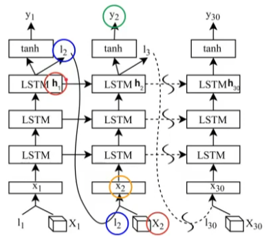 - \( X_2 \)와 \( l_2 \) 간의 가중합을 계산하여 attention value \( x_2 \)를 얻고 이것이 LSTM의 입력으로 들어감
