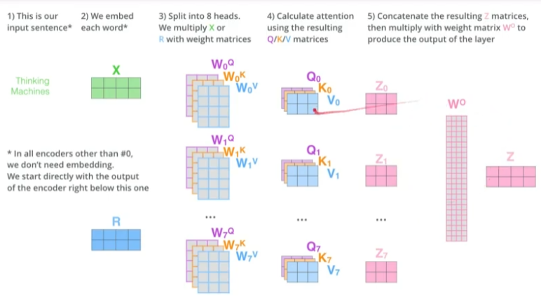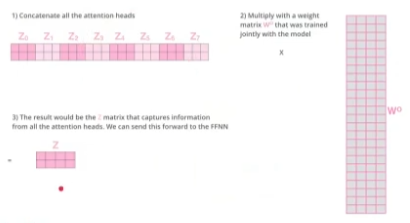 - multiple head에 따른 여러 개의 z들을 단순히 concatenation한 뒤에 가중치 \( W^o \)와 곱하여 원래 크기로 되돌림