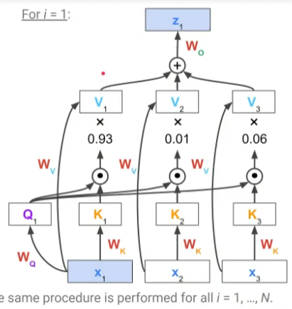 - \( z_i = W_1V_1 + ... + W_NV_N \), 그리고 \( W_j = cos(Q_j, K_j) \)