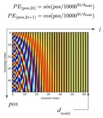 - 수식을 보면 i가 \( d_{model} \)에 가까워질 수록 사인 함수의 주기가 매우 작아짐. 즉 변동성이 거의 없음