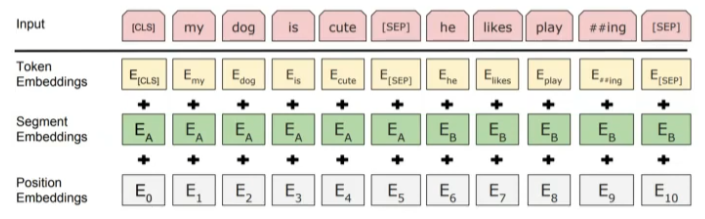 - 입력 시퀀스는 다음과 같은 임베딩들을 합친 두 개의 문장으로 구성