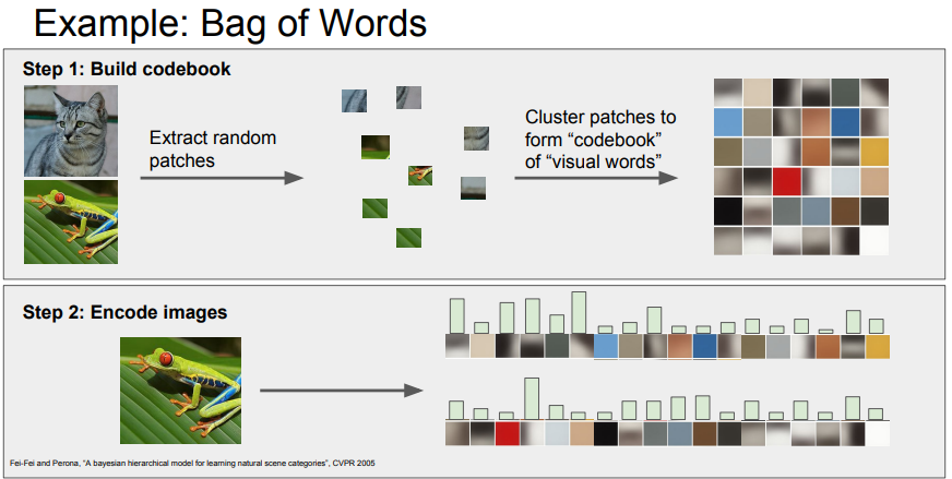 - 이미지를 임의로 조각낸 다양한 패치를 K-means 알고리즘으로 군집화하여 '시각 단어(visual words)'를 만듦