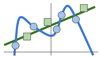 - 그림의 훈련 데이터(파란 점)를 잘 예측할 뿐만 아니라 새로운 데이터(초록 네모)도 잘 예측할 수 있도록 해야함