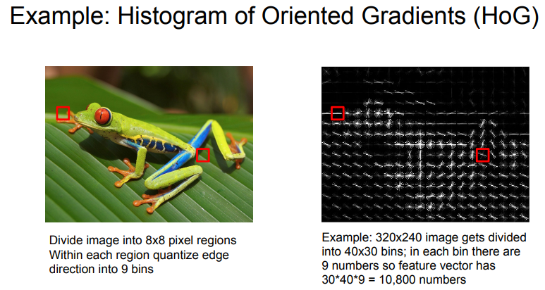 - 예를 들어 그림에서 HOG는 대각선 엣지를 많이 포함한 이파리를 정확하게 특징으로 잡아냅니다.